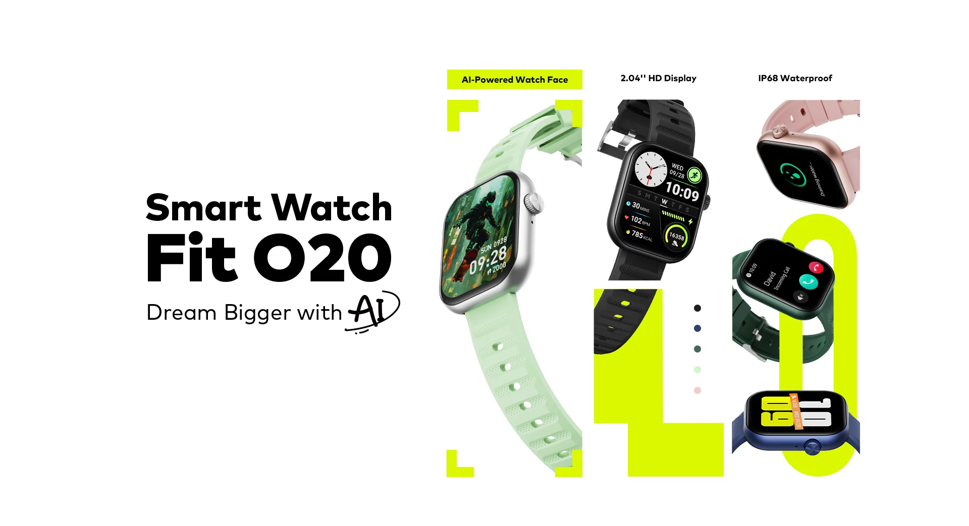 ساعة itel SmartWatch ISW-O20 (Fit 020) هي ساعة ذكية حديثة تتميز بشاشة كبيرة 2.04 إنش HD، مقاومة للماء والغبار بمعيار IP68، ودعم لمزايا متقدمة مثل واجهات الساعة التفاعلية المولدة بتقنية الذكاء الاصطناعي، اتصال بلوتوث للمكالمات والتنبيهات، وتتبع صحي ورياضي شامل.